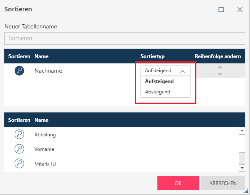 Stellen Sie den Sortiertyp ein, indem Sie „Aufsteigend“ oder „Absteigend“ in der Dropdown-Liste Sortiertyp neben einer Sortierspalte auswählen.
