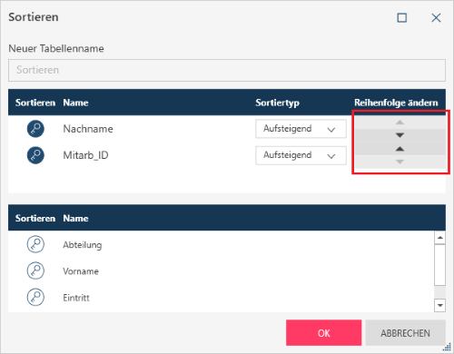 Monarch Data Prep Studio sortiert gemäß der Anordnung der Sortierspalten. Sie können die Reihenfolge ändern, indem Sie auf den Aufwärts-/Abwärtspfeil neben einer Spalte klicken.
