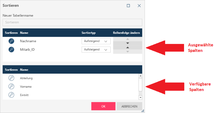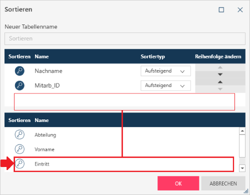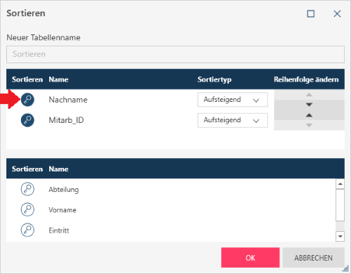 Klicken Sie auf das Schlüsselsymbol, um die Spalte aus der Liste der Spalten in die Liste der Sortierspalten zu verschieben: