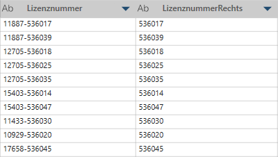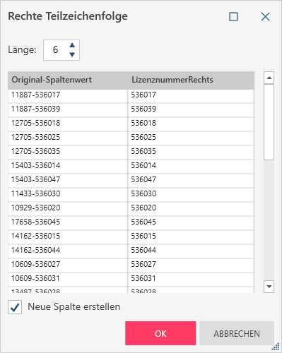 In diesem Beispiel ist die erste Spalte (Lizensnummer) die Originalspalte. Fünf Zeichen von rechts werden extrahiert, um die Werte in der zweiten Spalte zu produzieren: