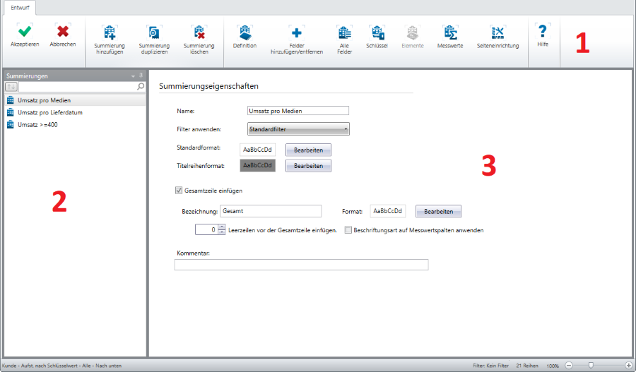 Im Modus „Summierungsentwurf“ können Sie Summierungen erstellen oder bearbeiten. Diesen Modus können Sie in der Summierungsansicht aufrufen.
