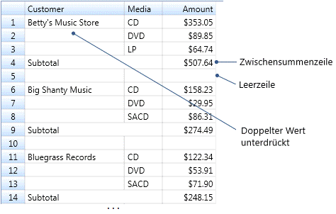 Die durch die Schlüsselfelder „Kunde“ und „Medien“ erstellten Summierungszeilen.