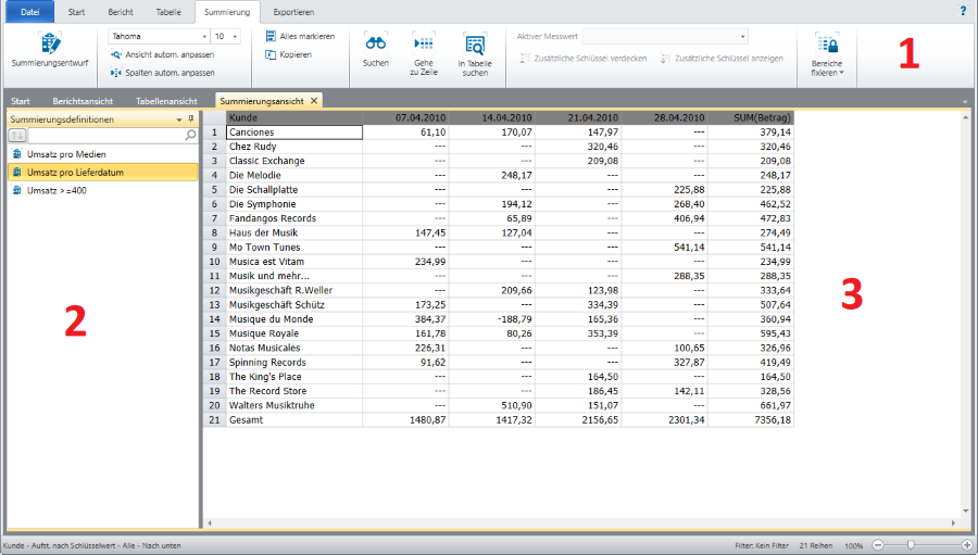 Summierungsansicht Zeigt die aktuell ausgewählte Summierung an. |