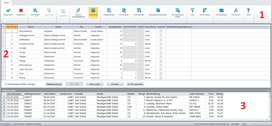 Multifunktionsleiste Zeigt alle Werkzeuge an, die zum Arbeiten mit einem Berichtsmuster notwendig sind. Weitere Informationen finden Sie unter Tabellenentwurf-Multifunktionsleiste – Referenz. |