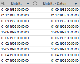 In diesem Beispiel ist Eintritt die ursprüngliche Spalte und Eintritt – Datum zeigt die konvertierten Werte.
