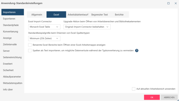 Weist Monarch Data Prep Studio an, ob neue Excel-Daten über den Monarch Excel Table Connector (d. h. die Aspose Engine) oder den ACE OLE DB Connector (d. h. die Legacy Engine) importiert werden sollen. |