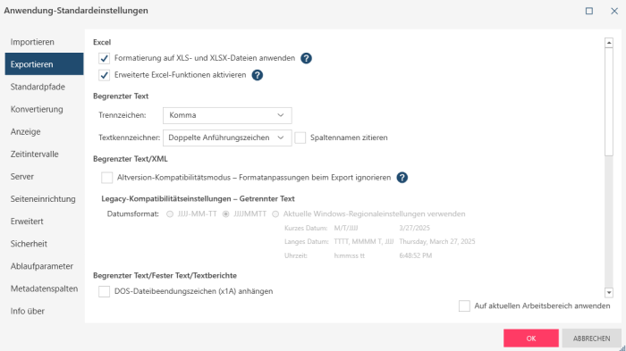 Gibt das Datumsformat beim Exportieren von Daten in eine Textdatei mit Trennzeichen an. Diese Einstellung kann nur konfiguriert werden, wenn die Einstellung Begrenzter Text/XML > Altversion-Kompatibilitätsmodus – Formatanpassungen beim Export ignorieren aktiviert ist. Die gültigen Optionen für das Datumsformat sind: