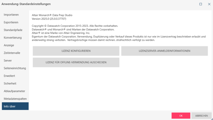 Zeigt relevante Informationen zur Monarch Data Prep Studio-Anwendung an, darunter die Versionsnummer und Altair- und Datawatch-Copyright-Mitteilungen.
