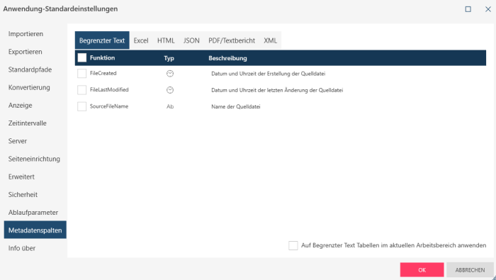 Wenn das Kästchen zum Anwenden auf <Dateityp>-Tabellen im aktuellen Arbeitsbereich aktiviert ist, werden alle Metadaten-Spalten, die für die angegebenen <Dateityp>-Tabellen ausgewählt wurden, in den aktuellen Arbeitsbereich importiert.