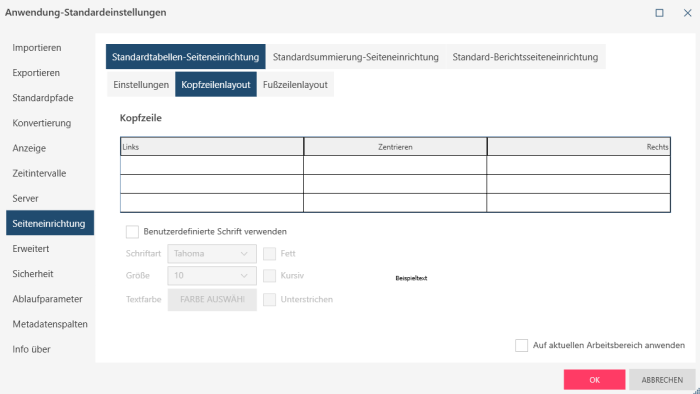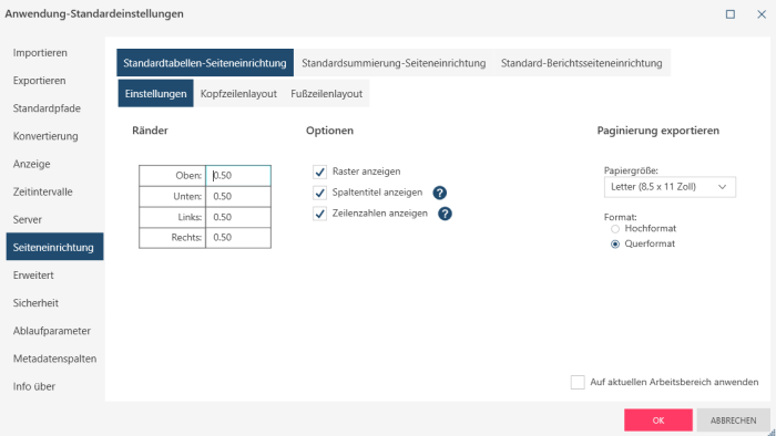 Die folgenden Standardeinstellungen für die Seiteneinrichtung gelten für Tabellen, Summierungen und Berichte, sofern nicht anders angegeben.