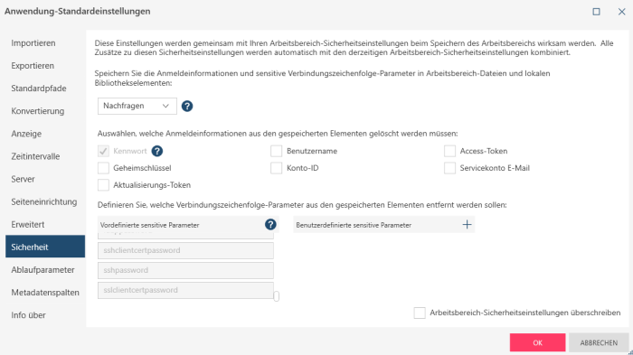 Zugangsdaten und sensitive Verbindungszeichenfolgen-Parameter in Arbeitsbereich-Dateien und lokalen Bibliothekselementen speichern |