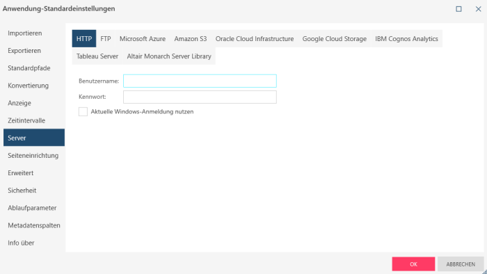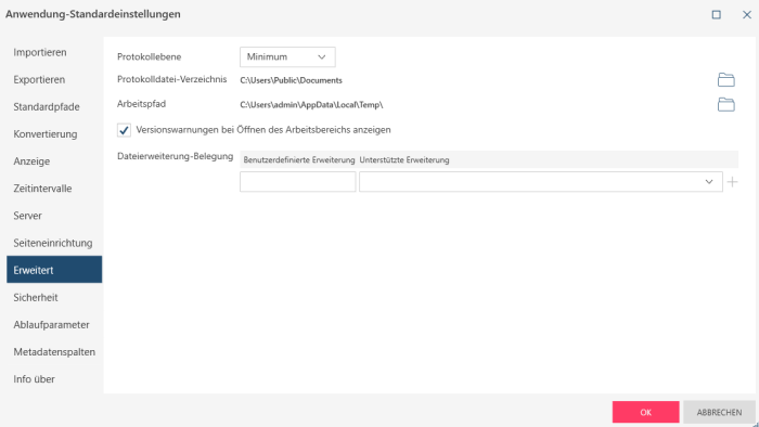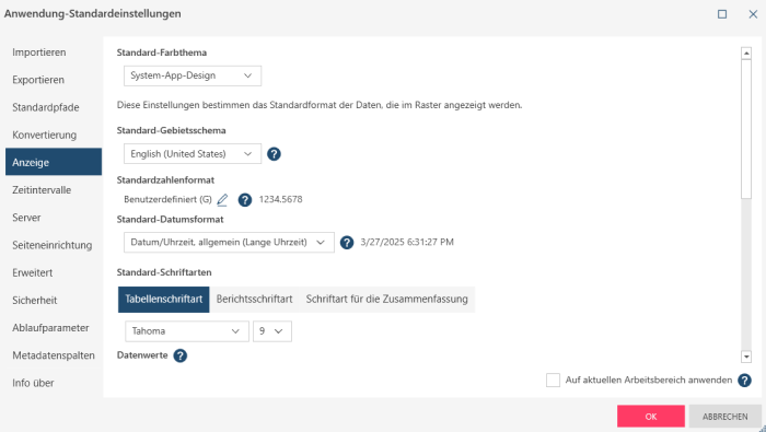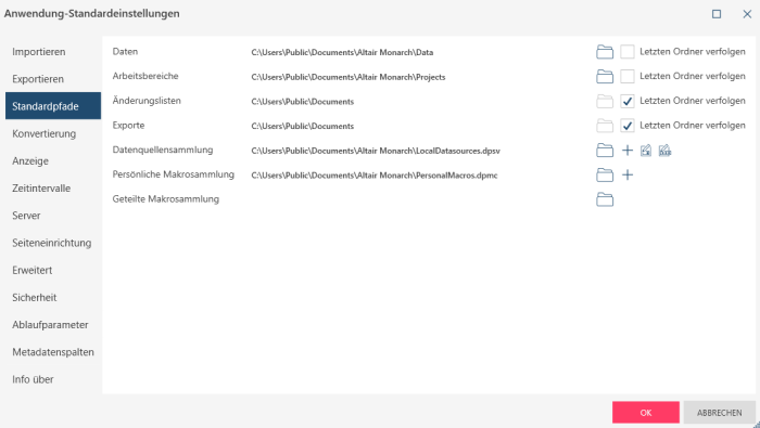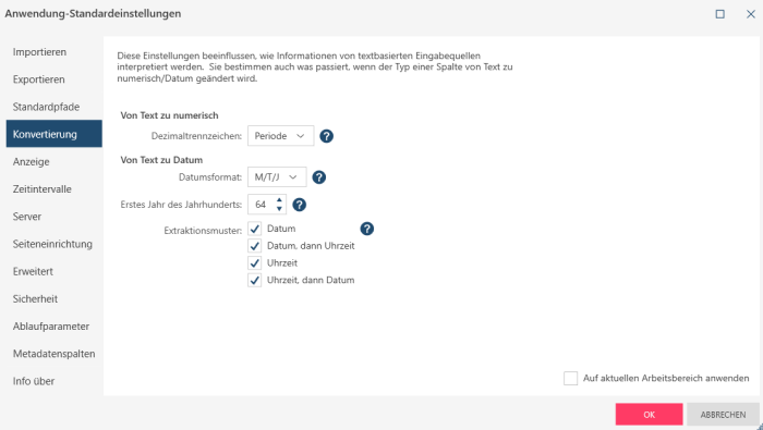 Die Standardeinstellungen der Anwendung ermöglichen das Festlegen globaler Arbeitsbereichseinstellungen (auf Anwendungsebene) für Monarch Data Prep Studio. Jede dieser Einstellungen wird im Folgenden ausführlich beschrieben.