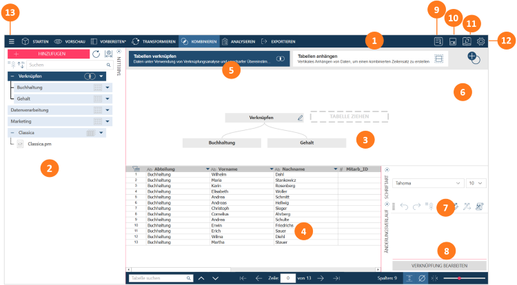 Mit der Phase „Kombinieren“ können Sie zwei oder mehr Tabellen verknüpfen oder anhängen. Die durchzuführende Vorgang kann aus einem Dropdown-Menü ausgewählt werden, wenn das Werkzeug Kombinieren angeklickt wird.