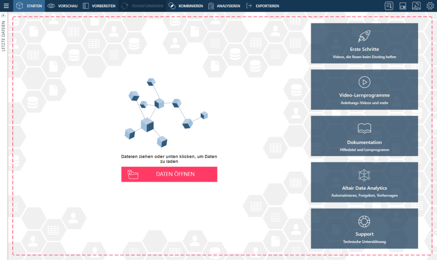 Die Startseite ist das erste Fenster, das beim Start von Monarch Data Prep Studio angezeigt wird.