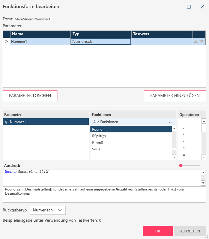 - Erstellen Sie die Funktion im Feld Ausdruck. Wenn Sie beispielsweise die Bruttosumme einer Zahl minus 12 % Steuern, auf zwei Stellen gerundet, berechnen möchten, könnten Sie dies über den Ausdruck „Runden/Abs(Nummer1)+(0,12*Nummer1),2)“ bewerkstelligen.
