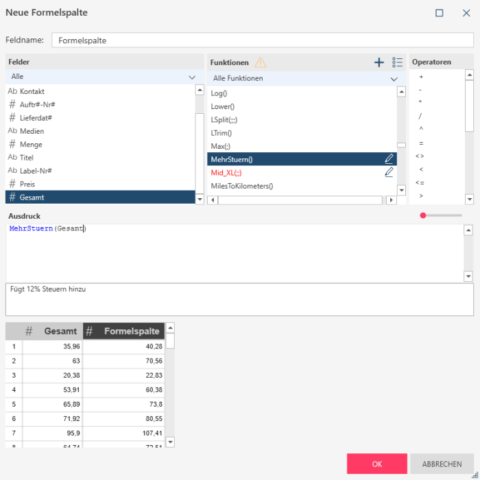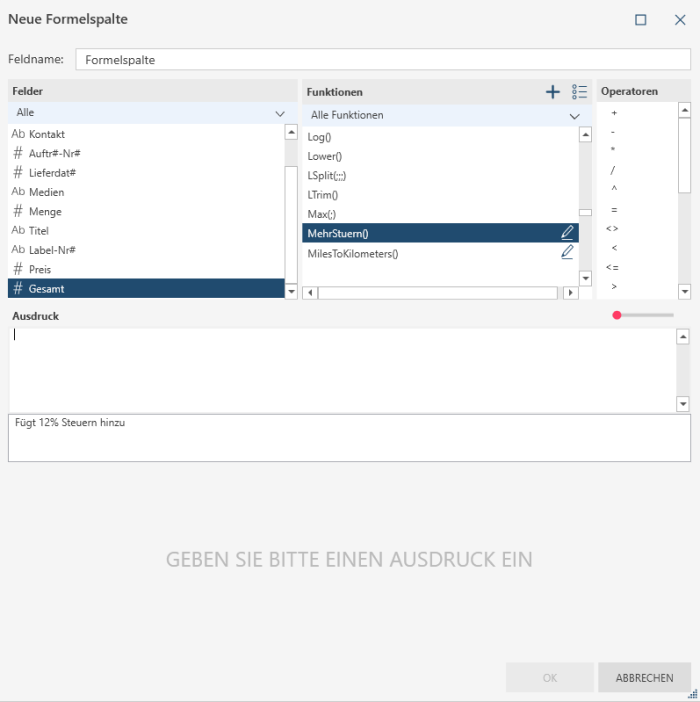 - Erstellen Sie den Berechnungsausdruck über die verfügbaren Werte in den Spalten Felder, Funktionen und Operatoren.