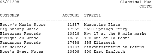 In vielen Berichten treten gewisse Datenfelder, wie z. B. Namen und Adressen, immer an der gleichen Stelle auf. In der nachstehenden Abbildung beginnen beispielsweise alle Kundennamen (horizontal gesehen) an der gleichen Stelle im Bericht. Auch alle Kundennummern und Straßennamen erscheinen immer an der gleichen Position.