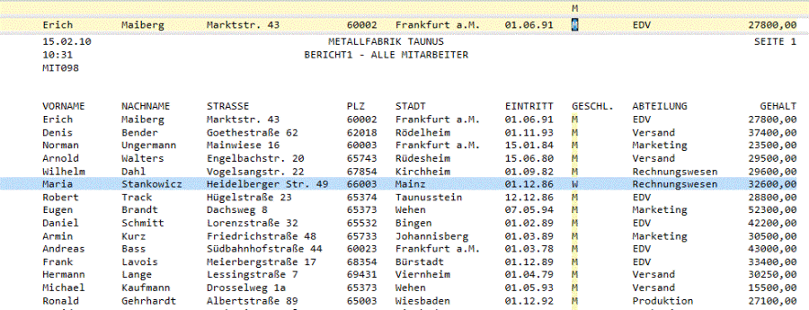 Auswahl der Daten für weibliche Mitarbeiter durch Anwendung des NOT-Selektors auf das Selektorzeichen „M“.