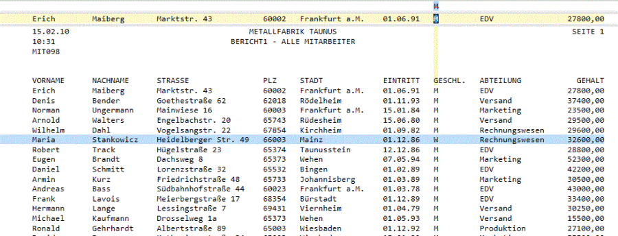 In der nachstehend gezeigten Grafik ist das „M“ in der Selektorzeile durchgestrichen, was anzeigt, dass das Normalverhalten dieses Selektorzeichens umgekehrt wurde und somit nur die Daten für die weiblichen Mitarbeiter der Firma ausgewählt werden. Hinweis: Das Selektorzeichen „M“ kann leicht wieder auf das Normalverhalten umgestellt werden, indem Sie erneut auf die Schaltfläche „NOT-Selektor“ klicken, wodurch dann wieder nur die Daten für männliche Mitarbeiter ausgewählt werden.