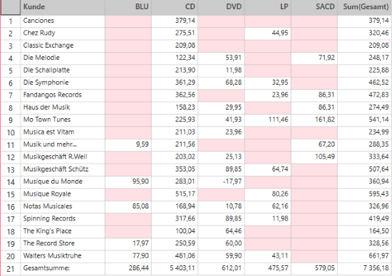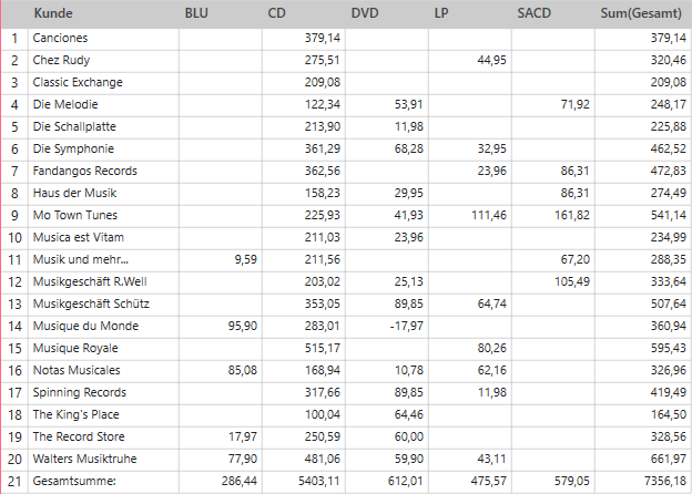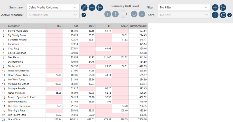 Die folgenden Beispiele zeigen eine einzige Summierung, in der alle Messwerte nach Schlüssel und nach Messwert angezeigt werden. In ähnlicher Weise wird für diese Summierung Kunde als Zeile definiert, Medien als Spalten und Betrag und Menge als Messwerte.