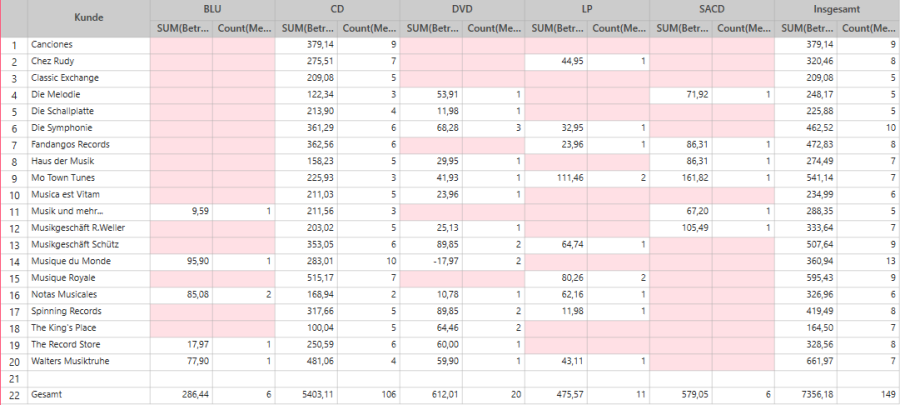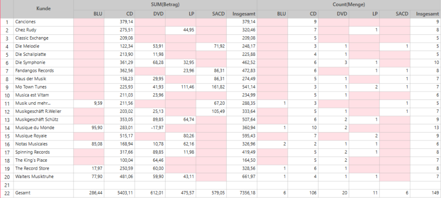 Diese beiden Ansichten stammen aus einer einzigen Summierung, in der „Kunde“ als Zeile definiert ist, „Medien“ als Spalte und „Anzahl“ und „Betrag“ als Messwerte.