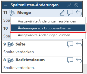 Sie können Änderungen aus einer Änderungsgruppe entfernen, indem Sie sie markieren (verwenden Sie ggf. STRG+Klicken, um mehrere Änderungen auszuwählen), mit der rechten Maustaste klicken und dann Änderung entfernen/Ausgewählte Änderungen aus Gruppe entfernen auswählen.