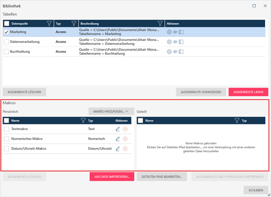 Geteilt - Geteilte Makros sind Makros, die von anderen Benutzern in deren eigenen Arbeitsbereichen erstellt und in einer Makrosammlungsdatei (.dpmc) gespeichert wurden. Diese Dateien können in Ihren Arbeitsbereich importiert werden, und Sie können mit ihnen arbeiten, als wären es Ihre eigenen Dateien.