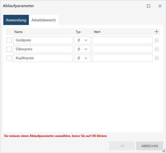Anwendungs-Ablaufparameter können von allen Tabellen in allen Arbeitsbereichen innerhalb der Anwendung verwendet werden.