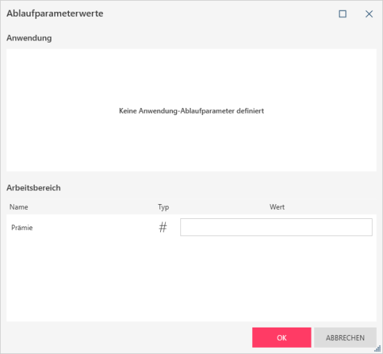 Öffnen Sie den Arbeitsbereich. Das Dialogfeld Ablaufparameterwerte wird angezeigt.