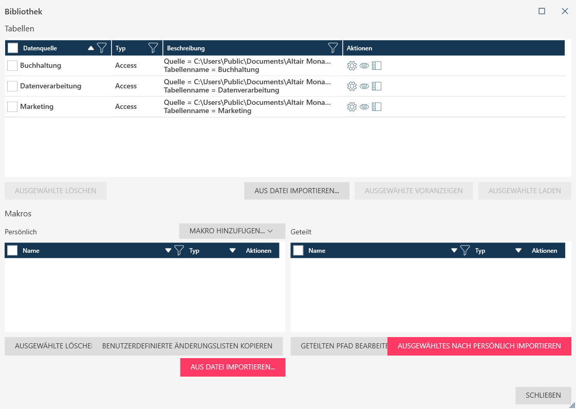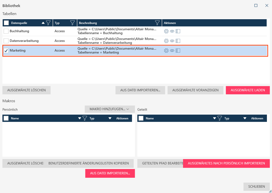 Diese Datenquellen werden im Dialogfeld Bibliothek aufgelistet.
