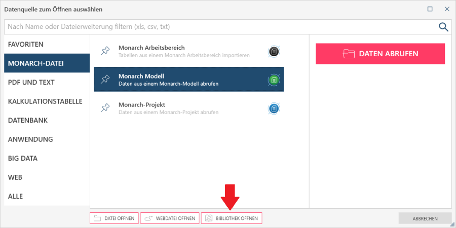 Wählen Sie Bibliothek öffnen im Dialogfeld Datenquelle zum Öffnen auswählen.
