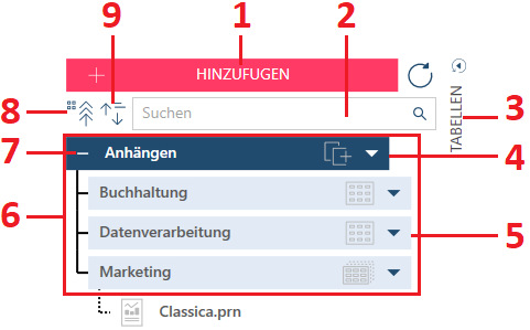 Schaltfläche Hinzufügen Klicken auf diese Schaltfläche ermöglicht das Öffnen des Arbeitsbereichs und das Hinzufügen neuer Tabellen zum Arbeitsbereich. |
