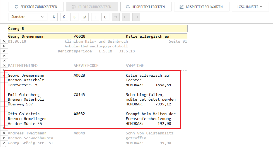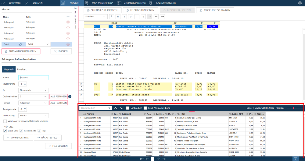 Während Sie Ihr Muster erstellen, können Sie eine Vorschau der extrahierten Daten erhalten, indem Sie einen Teil der Datensätze in der Datenvorschau von Berichtsentwurf anzeigen.