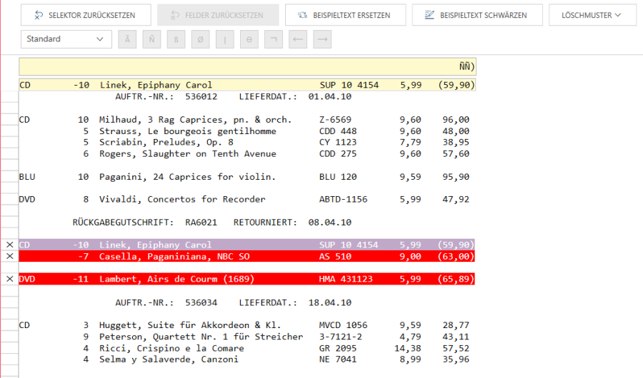 In der Abbildung oben wird das Ausschlussmuster beispielsweise durch eine rote Zeile markiert. Mit diesem Muster wird die Auftragsnummer und das Lieferdatum jedes zu erfassenden Datensatzes erfasst, auch wenn ein Doppelpunkt zum Auswählen dieser Einzelheiten verwendet wird.