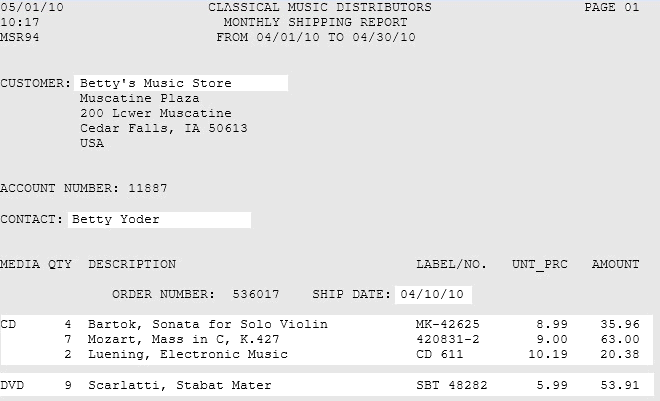 Viele Berichte sind auf mehreren Ebenen sortiert. Die im nachstehenden Bericht gezeigten Versandartikel sind z. B. nach Kunden und Lieferdatum sortiert. In diesem Fall ist der Kunde die höchste und das Lieferdatum die zweithöchste Sortierebene. Die Felder mit den einzelnen Transaktionen befinden sich auf der Detailebene. Falls der Bericht aus mehreren Sortierebenen besteht, müssen Sie für jede Ebene, aus der Daten extrahiert werden sollen, ein separates Muster definieren.