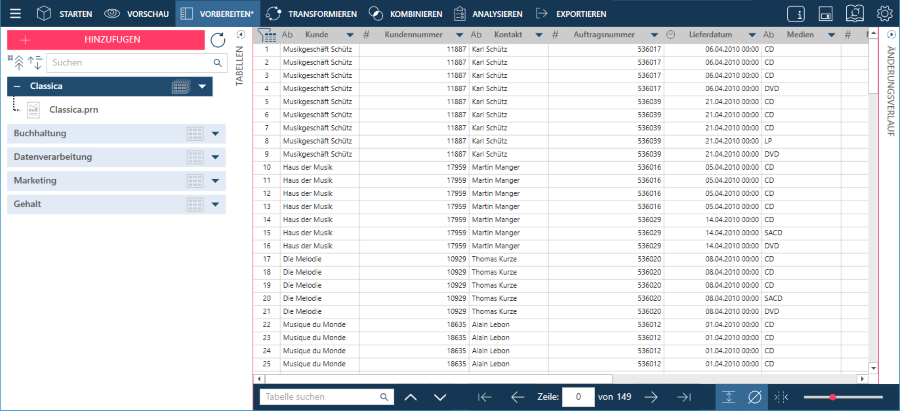 Wenn in Monarch Data Prep Studio Daten aus einem Bericht extrahiert werden, werden diese Daten in einer Datenbanktabelle platziert, die im Fenster Vorbereiten von Monarch Data Prep Studio angezeigt und manipuliert werden kann. Die Datenbanktabelle besteht aus Datenreihen und -spalten. Jede Reihe stellt einen Datensatz und jede Spalte ein Feld dar.