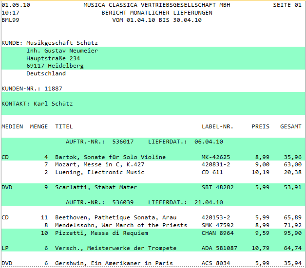 Bei Anzeige eines Berichts im Berichtsfenster können Sie sich mithilfe der Option „Computerpapier“ von Monarch Classic einen Bericht wie auf grün und weiß gestreiftem Computerpapier geschrieben ansehen. Diese Option kann Ihnen beim Studieren von nicht sehr dicht geschriebenen Berichten behilflich sein, denn durch die grünen Streifen verlieren Sie nicht so leicht die Zeilen aus den Augen.