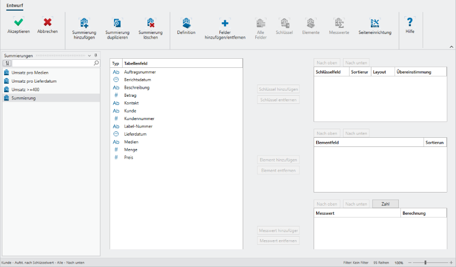 Die durch die Schlüsselfelder „Kunde“ und „Medien“ erstellten Summierungszeilen.