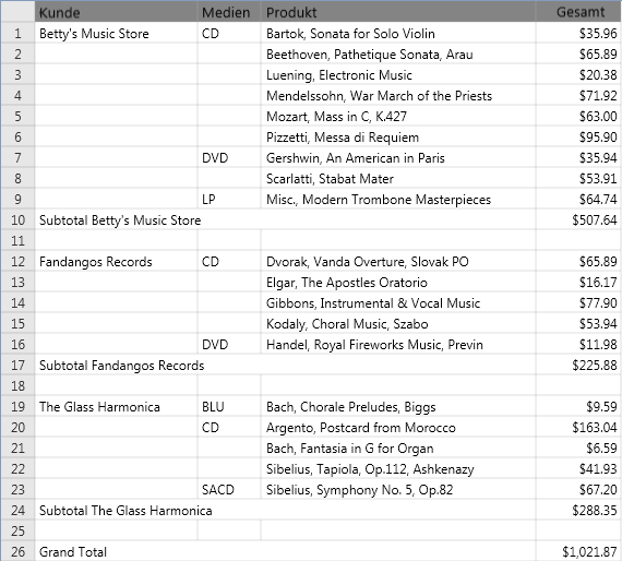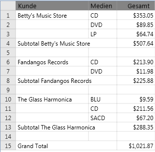 Durch das Aus- bzw. Einblenden eines Teils der Summierung können Sie den Datensatz einer Summierung auf schnelle Weise betrachten und analysieren. Durch das Ausblenden (Verdecken eines Teils der Summierung) verringern Sie die Detailebene in der Summierung und zeigen dadurch Informationen einer höheren Ebene an. In der nachfolgenden Summierung werden die Verkäufe nach Medientyp für jeden einzelnen Kunden unterteilt. Die Gesamtverkäufe werden (nach Medientyp aufgeteilt) ebenfalls für jeden Kunden angezeigt. Durch das Ausblenden von Teilen der Summierung kann Monarch Classic die Gesamtverkäufe für die einzelnen Medientypen zusammenfassen und in einer Summe pro Kunde anzeigen.