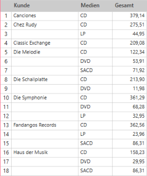 Durch das Aus- bzw. Einblenden eines Teils der Summierung können Sie den Datensatz einer Summierung auf schnelle Weise betrachten und analysieren. Durch das Ausblenden (Verdecken eines Teils der Summierung) verringern Sie die Detailebene in der Summierung und zeigen dadurch Informationen einer höheren Ebene an. In der nachfolgenden Summierung werden die Verkäufe nach Medientyp für jeden Kunden unterteilt. Die Gesamtverkäufe werden (nach Medientyp aufgeteilt) ebenfalls für jeden Kunden angezeigt. Durch das Ausblenden von Teilen der Summierung kann Monarch Data Prep Studio Gesamtverkäufe für die einzelnen Medientypen zusammenfassen und in einer Summe pro Kunde anzeigen.