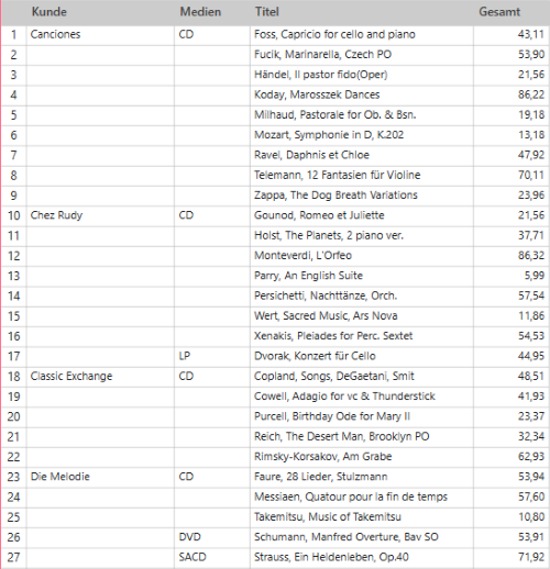 Summierung von Gesamtverkäufen für zwei Kunden, nach Medientyp unterteilt.