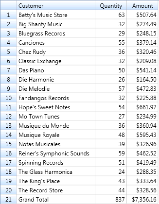 Das Summierungsfenster wird dazu verwendet, eine Analyse der Daten zu erstellen, die Summierungsbericht oder einfach Summierung genannt wird. Eine Summierung fasst Informationen über ausgewählte Felder tabellarisch zusammen und stellt die Ergebnisse in einer ein- oder zweidimensionalen Matrix dar. Die unten aufgeführten Summierungen zeigen beispielsweise die Umsätze einer fiktiven Vertriebsgesellschaft für klassische Musik nach Kunde und dann nach Medientyp an.
