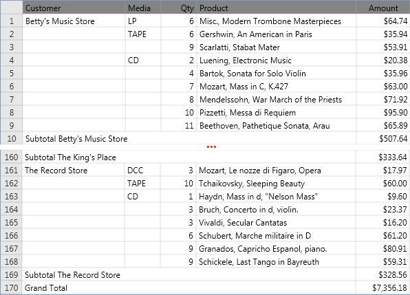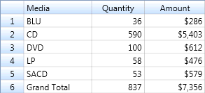 Die Summierung in Abbildung 4 enthält die Schlüsselfelder „Kunde“ und „Medien“ sowie die Elementfelder „Menge“ und „Produkt“. Diese Summierung zeigt die Transaktionen pro Kunde und unterteilt nach Medientypen. Zwischensummen werden sowohl auf der Ebene der Medien als auch auf der Ebene der Kunden erstellt.