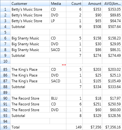 Abbildung 3. Umsatz, unterteilt nach Kunde und Medien. In der Spalte COUNT wird die Anzahl der Transaktionen angezeigt und in den Betragsspalten die Beträge für den Gesamt- sowie den Durchschnittsumsatz für die einzelnen Schlüssel.
