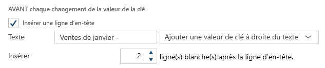 Dans l’onglet Mise en page, allez à la section AVANT chaque changement de la valeur de la clé, cochez la case Insérer une ligne d’en-tête, puis saisissez une valeur numérique dans Insérer n ligne(s) blanche(s) après la ligne d’en-tête pour spécifier le nombre de lignes blanches à ajouter après la ligne d’en-tête.