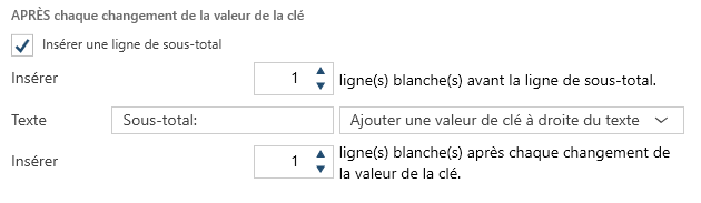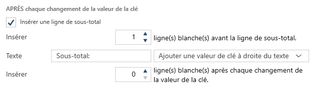 Dans l’onglet Mise en page, allez à la section APRÈS chaque changement de la valeur de la clé, cochez la case Insérer une ligne de sous-total, puis saisissez une valeur numérique dans Insérer n ligne(s) blanche(s) avant la ligne de sous-total pour spécifier le nombre de lignes blanches à ajouter avant la ligne de sous-total.