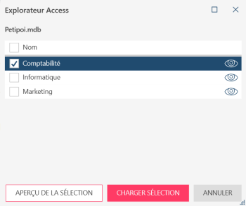 Lorsque certaines sources de données basées sur des fichiers sont ouvertes, d’autres paramètres doivent être spécifiés via un explorateur pour s’assurer que la table correcte est importée dans l’application. Par exemple, si votre source de données est un fichier Microsoft Access contenant plusieurs tables, vous pouvez sélectionner la ou les tables à ouvrir via l’explorateur Access.