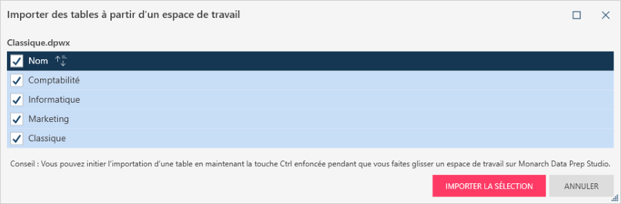 Si l’espace de travail contient une seule table, elle est ajoutée à l’espace de travail. Sinon, la boîte de dialogue Importer des tables à partir d’un espace de travail s’affiche. Dans cette boîte de dialogue, sélectionnez les tables de l’espace de travail que vous souhaitez ajouter à votre espace de travail actuel.