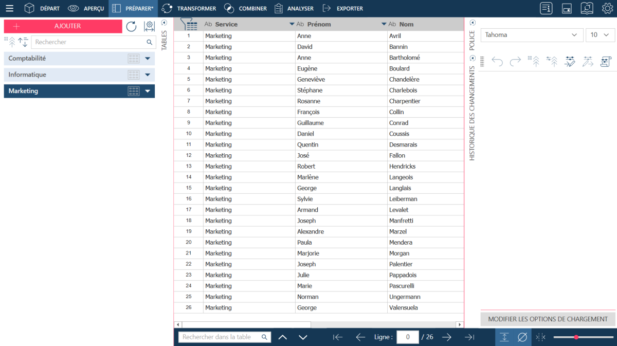 - D’autres tables, telles que celles provenant de sources de données tierces ou basées sur le Cloud, s’ouvrent directement dans la fenêtre Préparer.