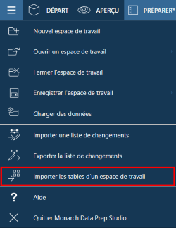 Cliquez sur l’icône du menu d’application en haut à gauche de l’écran, puis sélectionnez Importer les tables d’un espace de travail dans les options qui s’affichent.